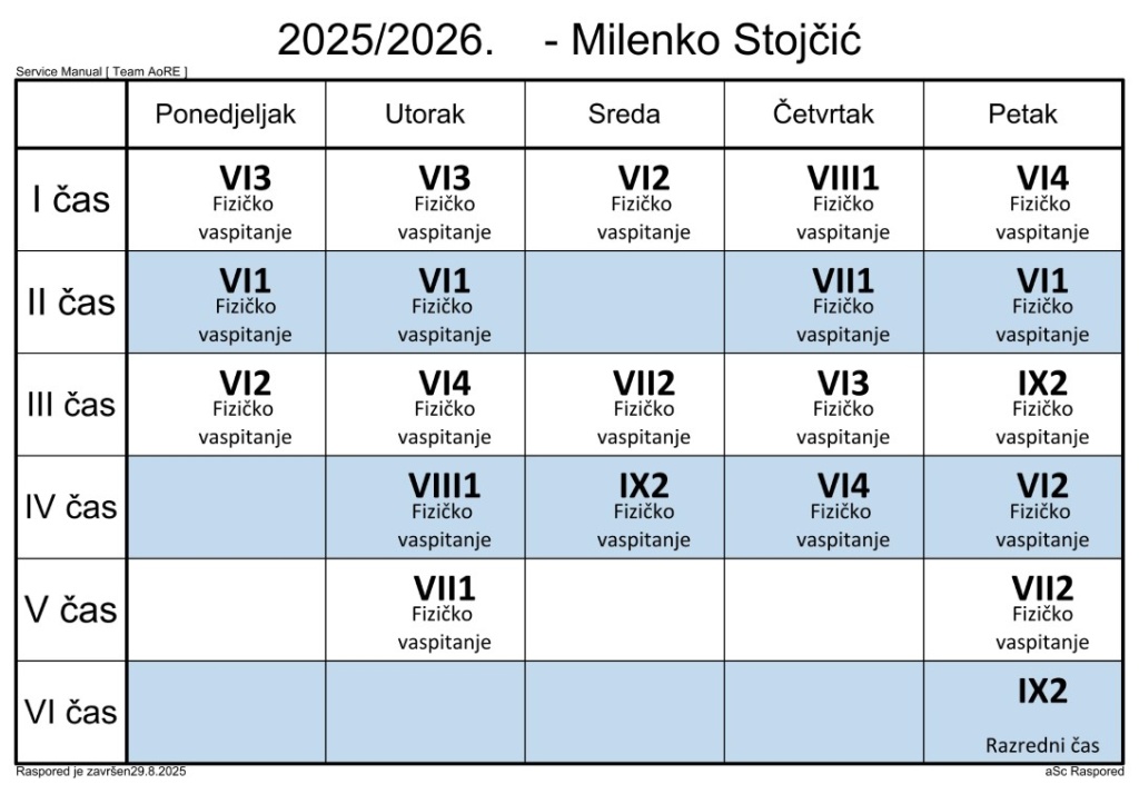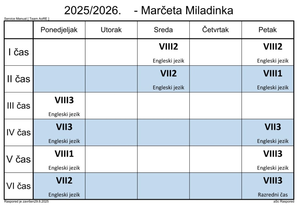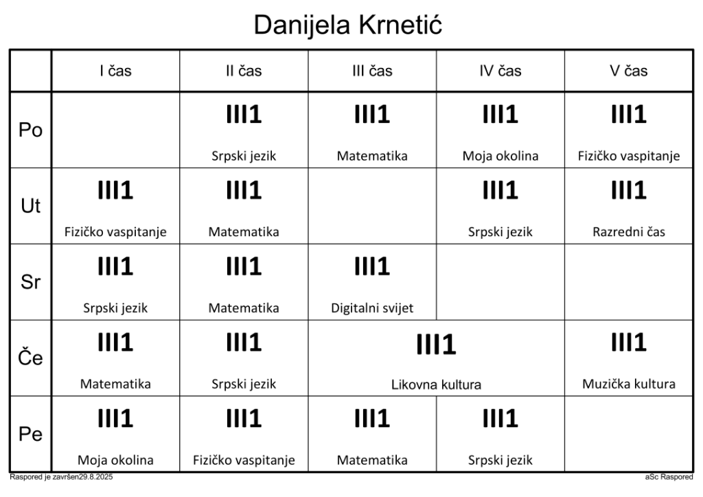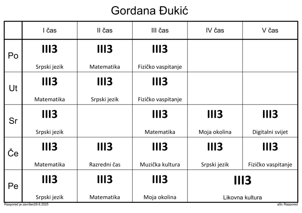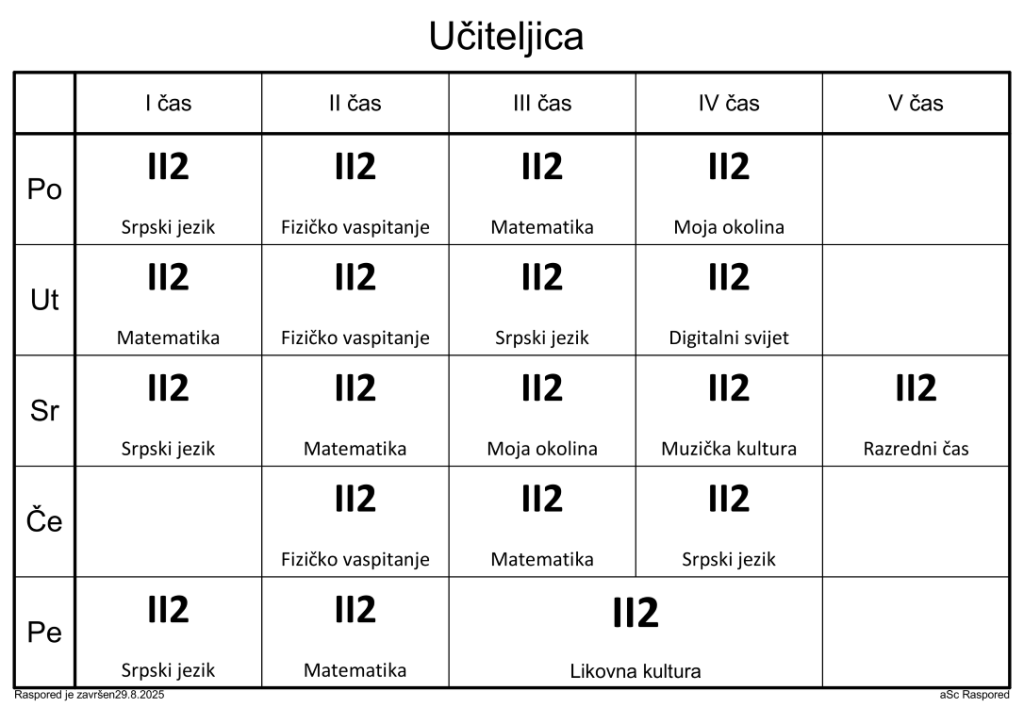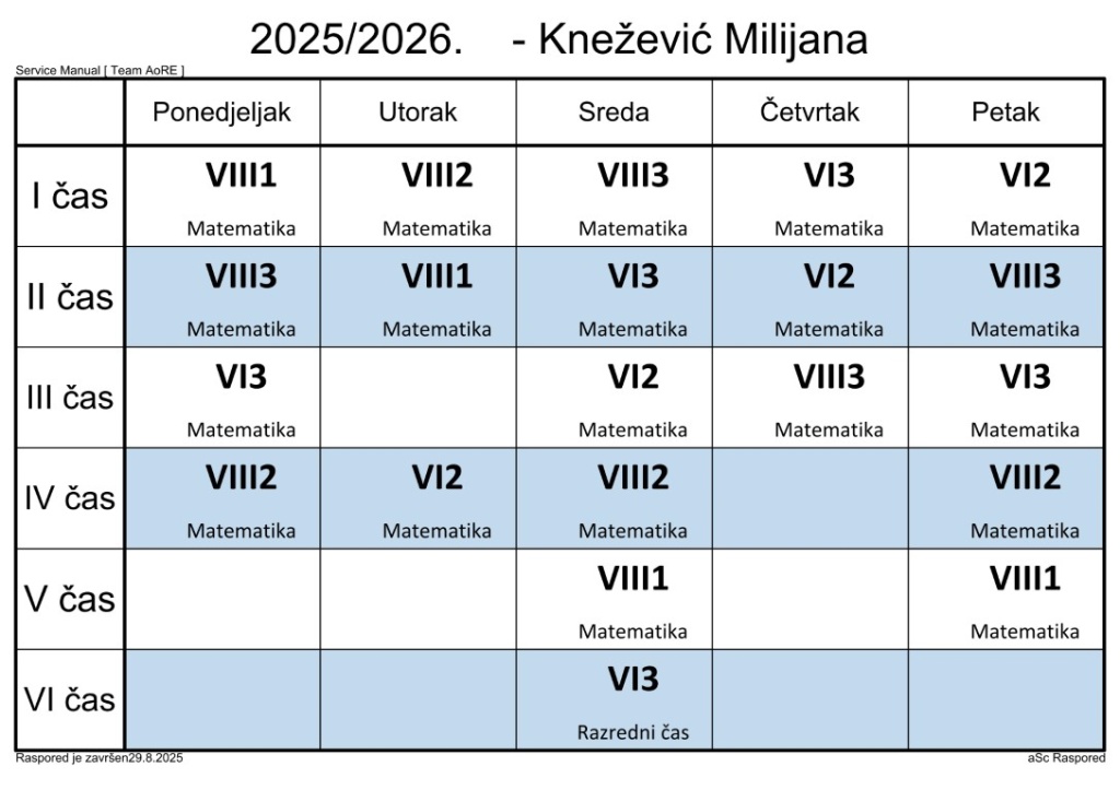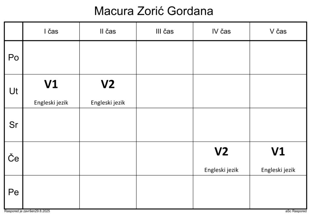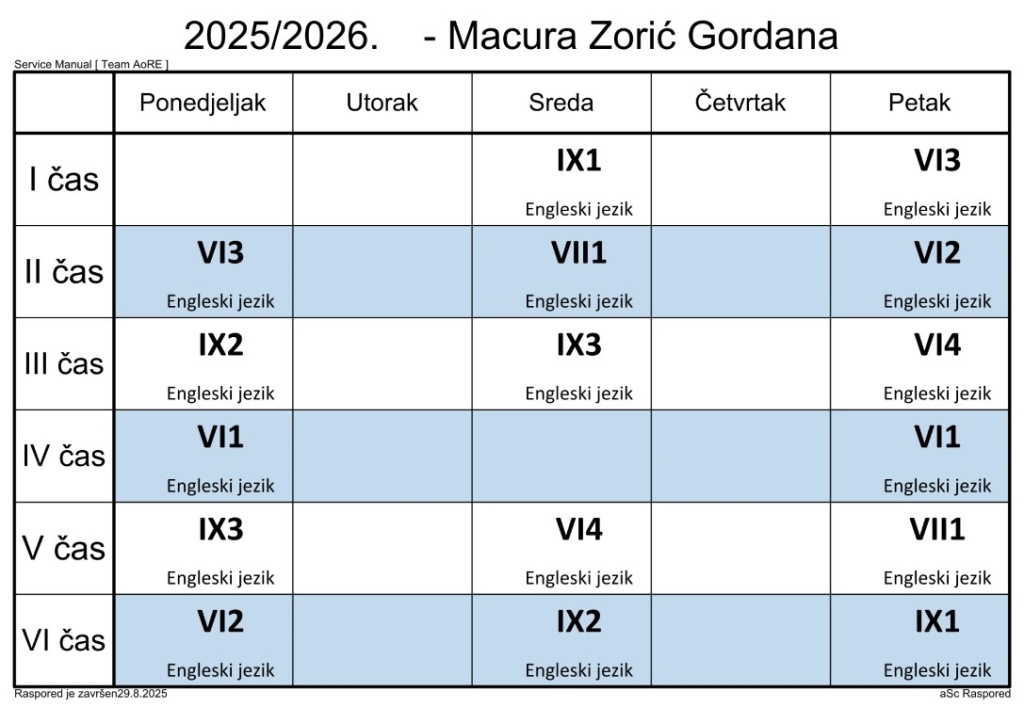 Распоред часова за наставнике у школској 2025/2026. години
