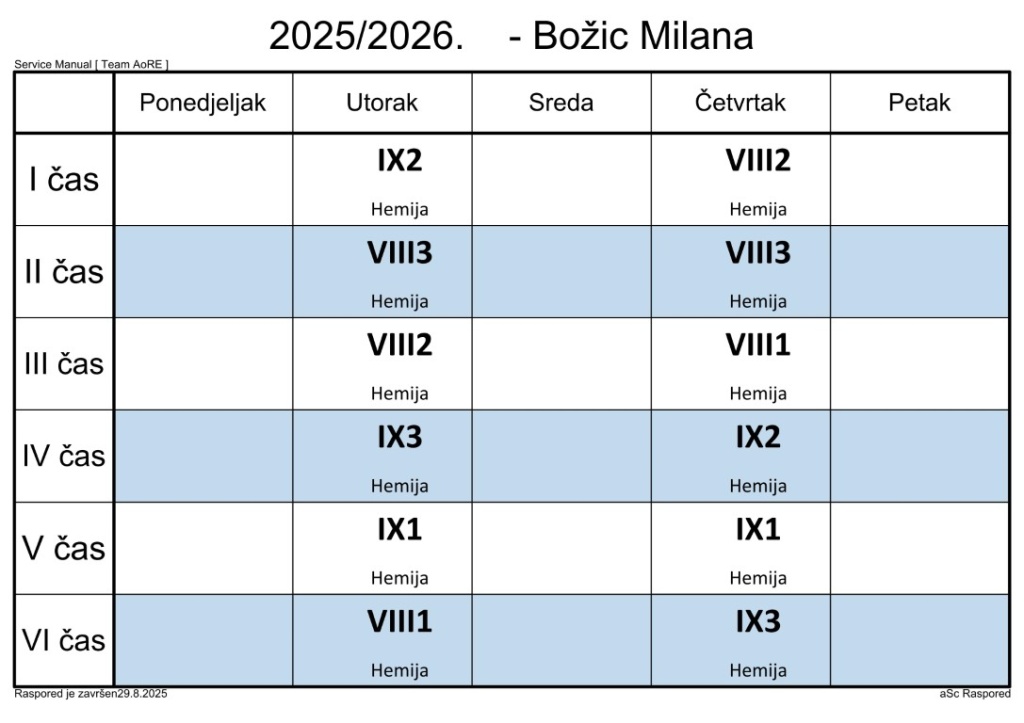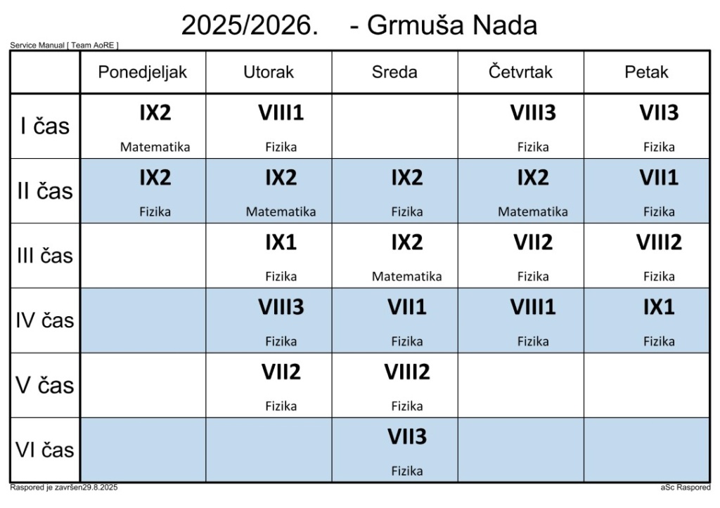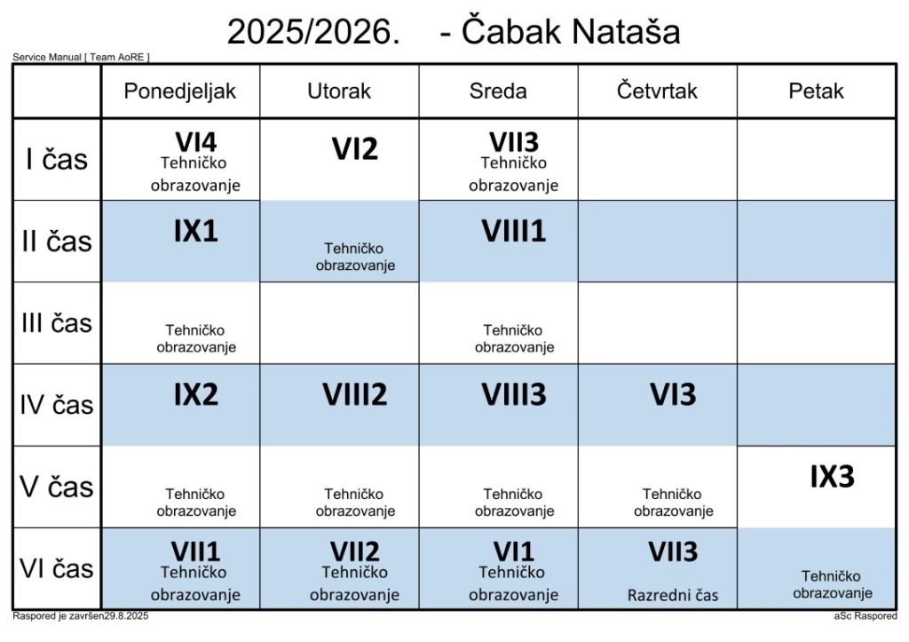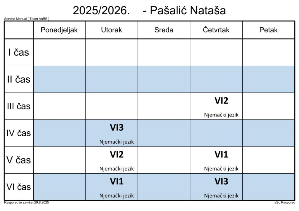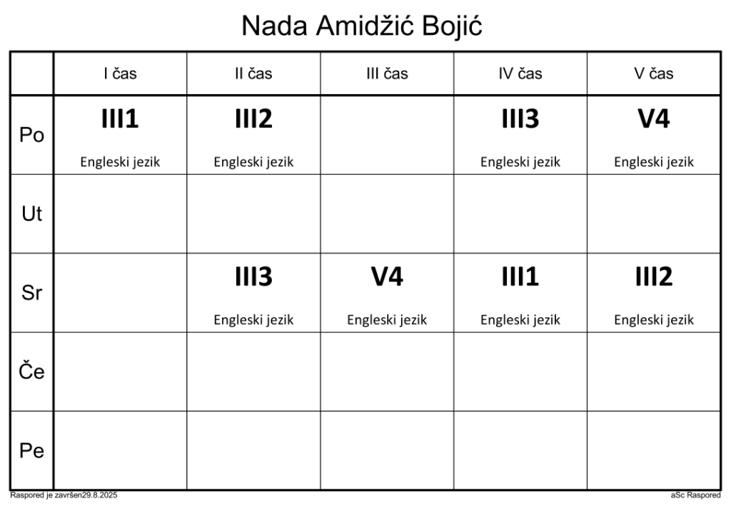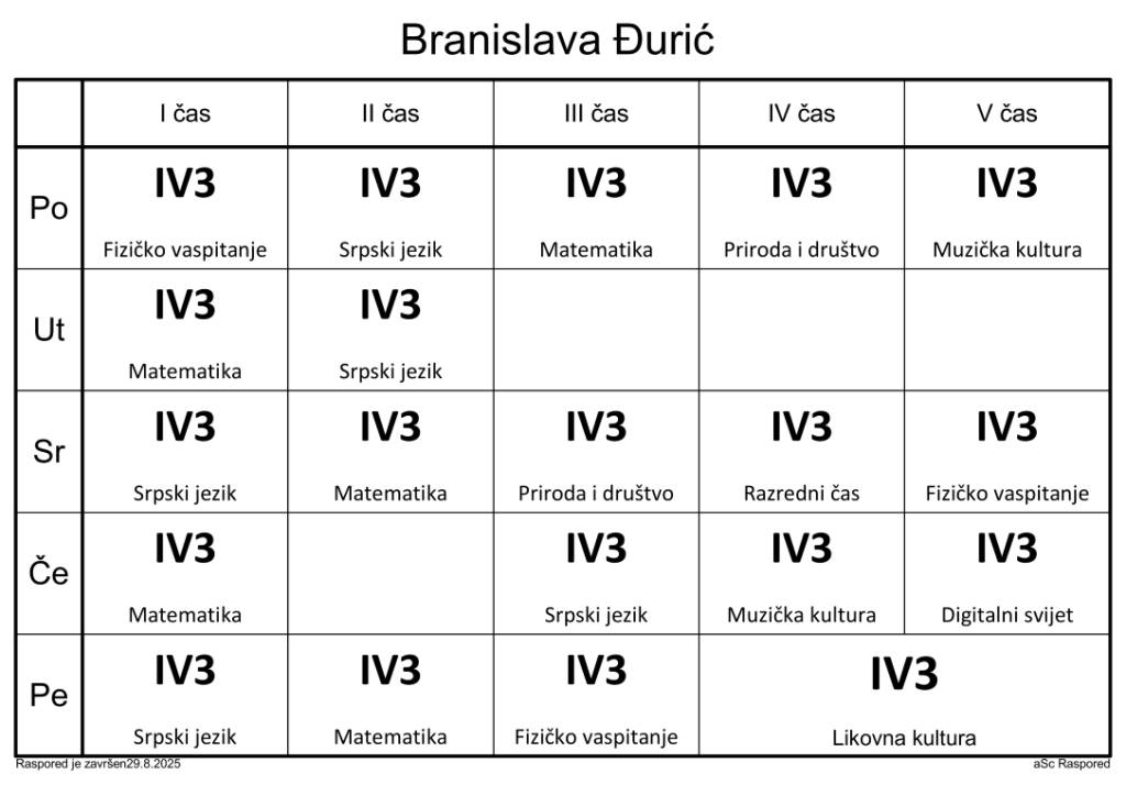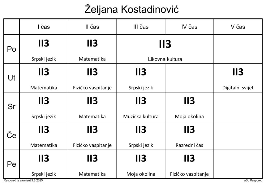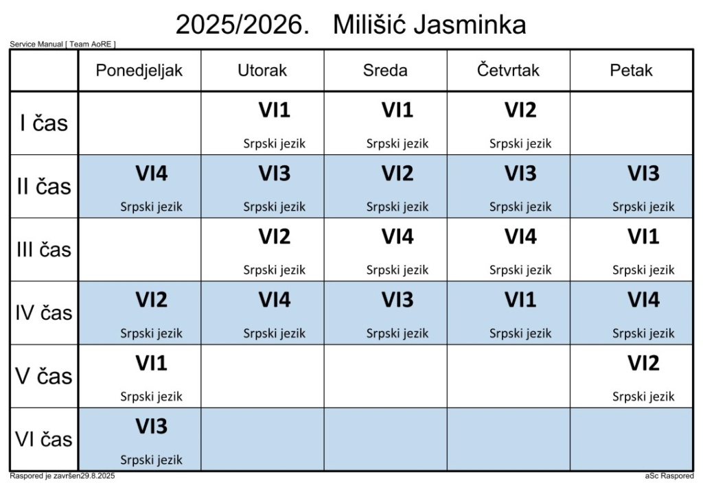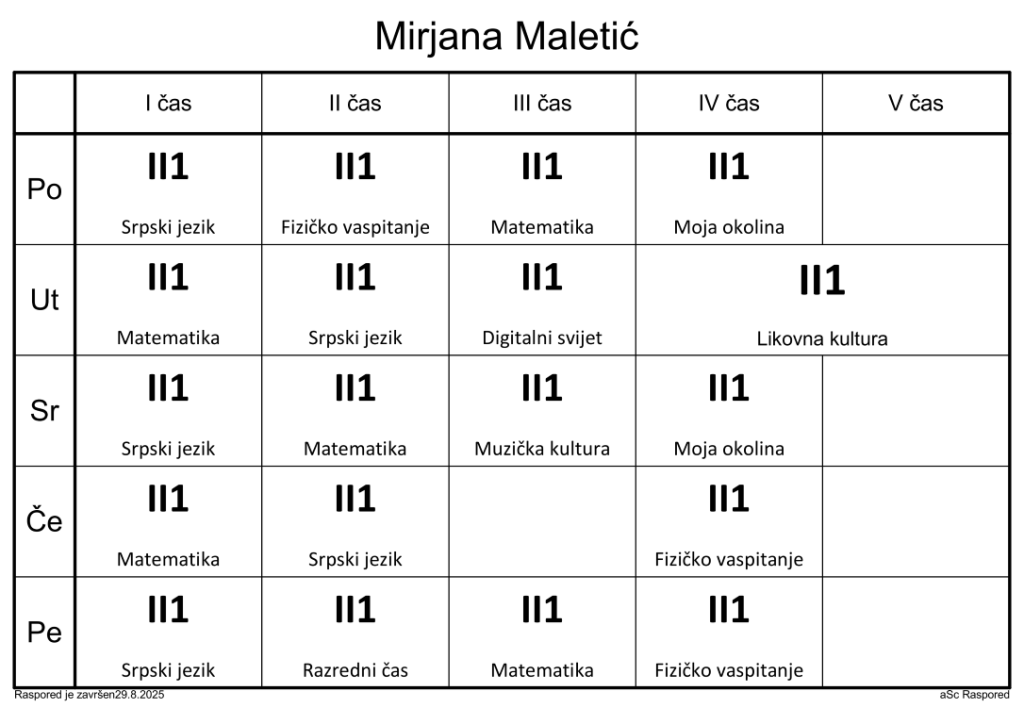 Распоред часова за наставнике у школској 2025/2026. години