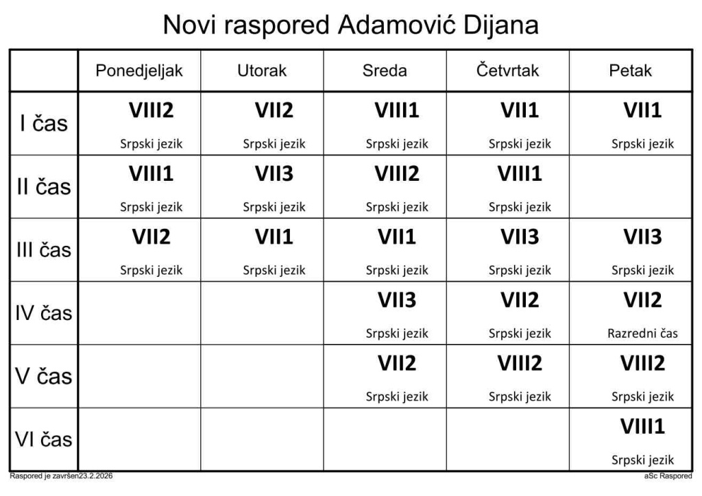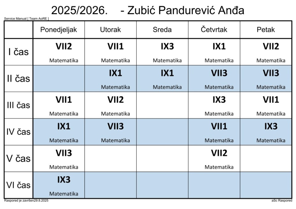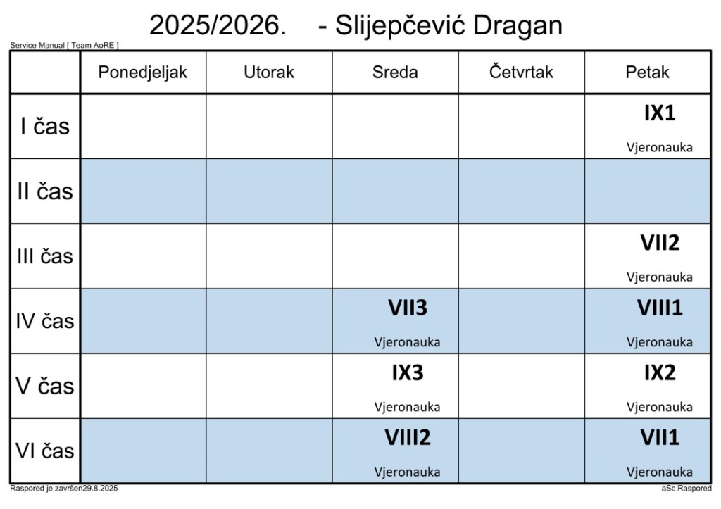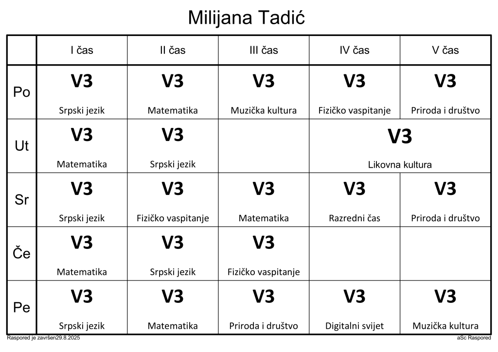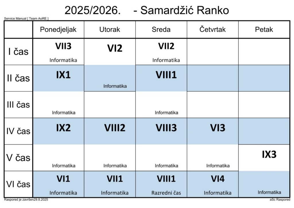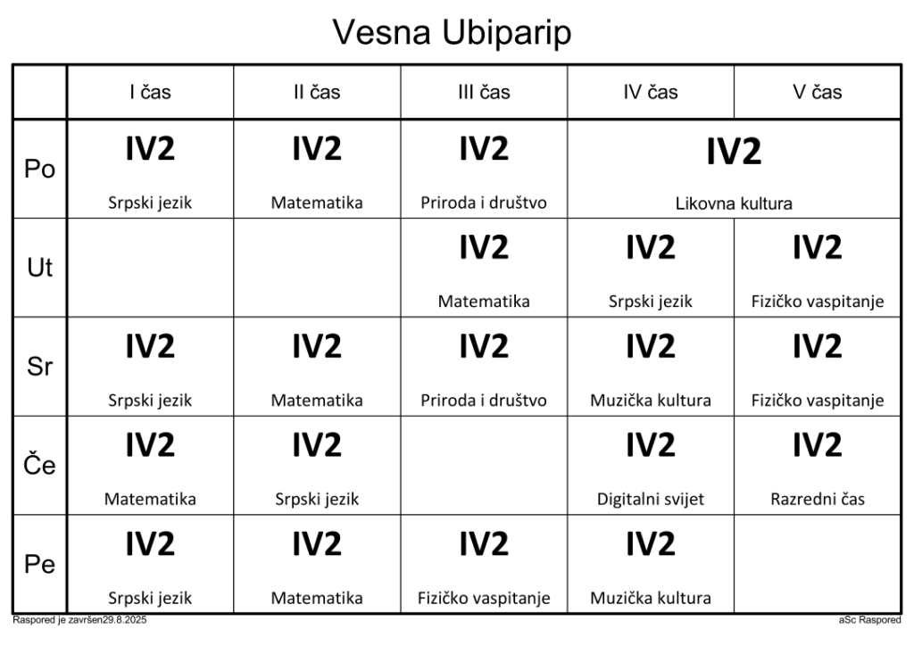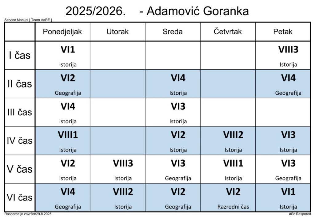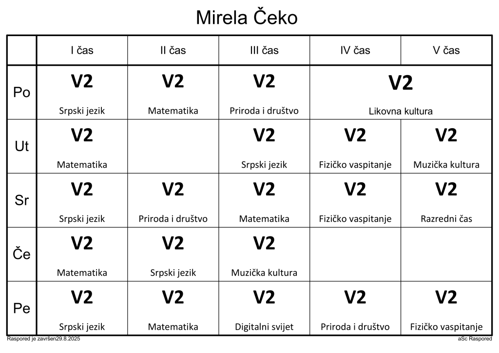 Распоред часова за наставнике у школској 2025/2026. години
