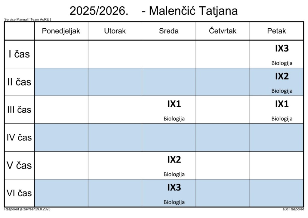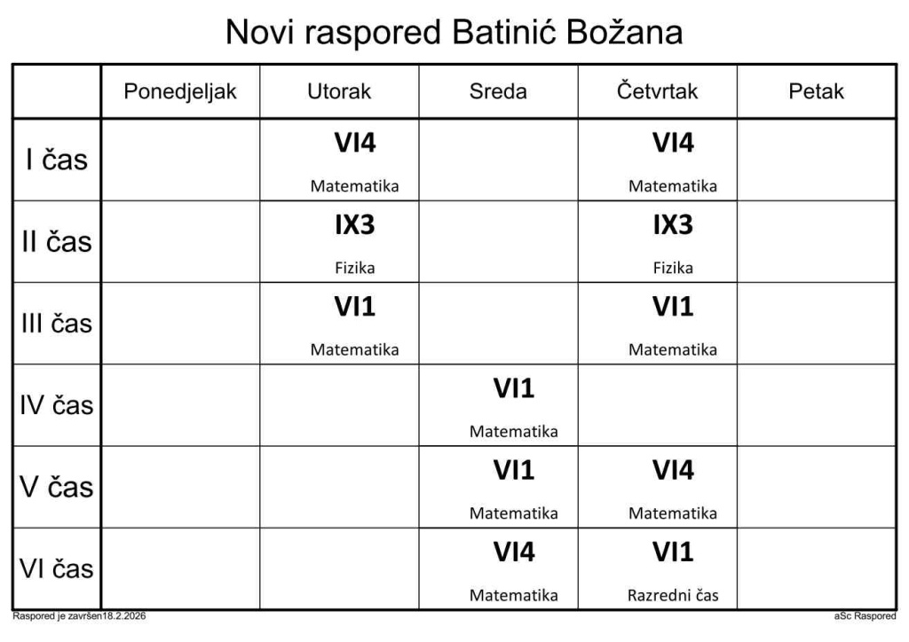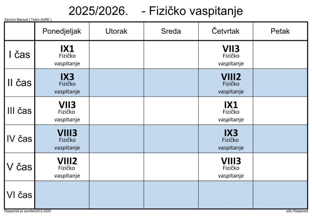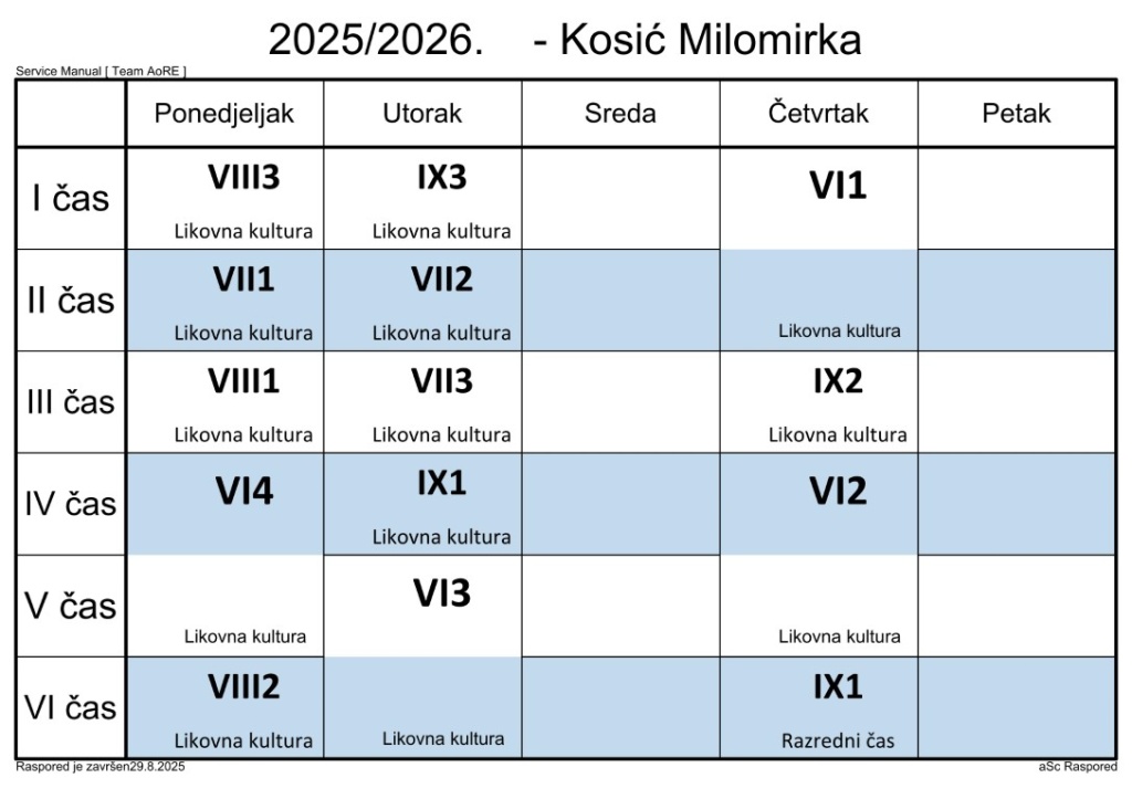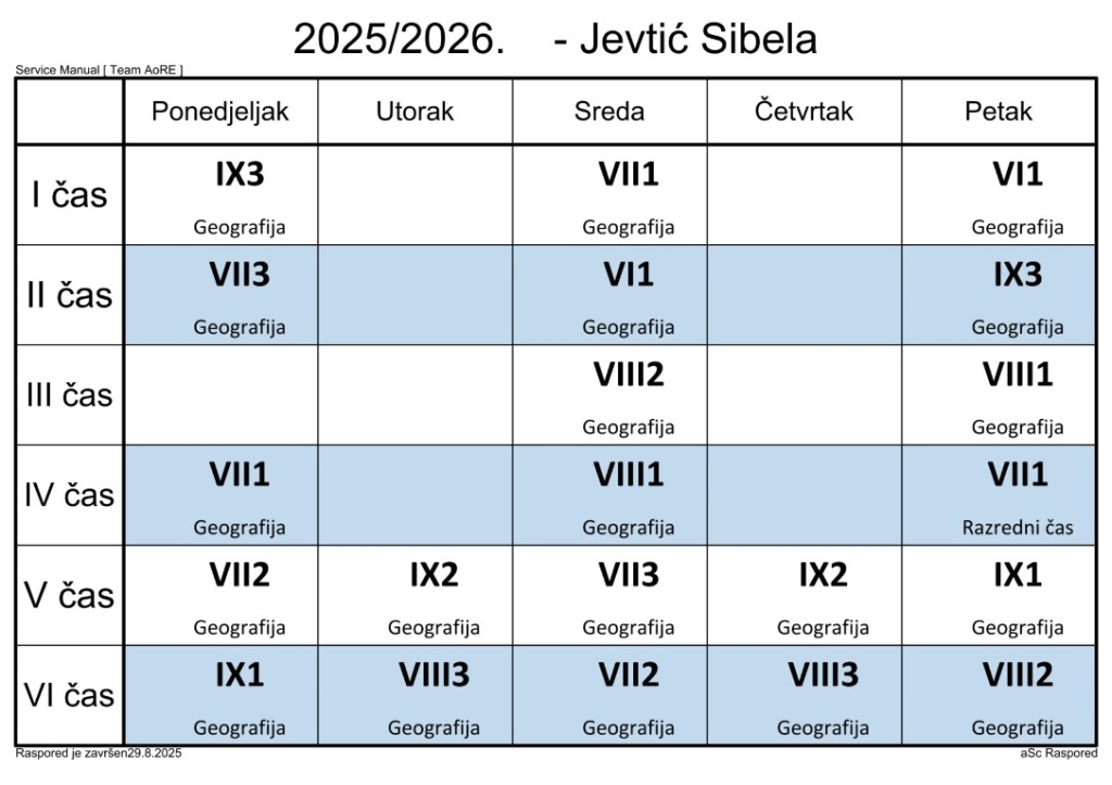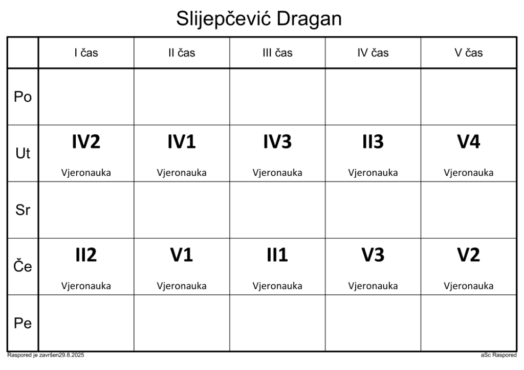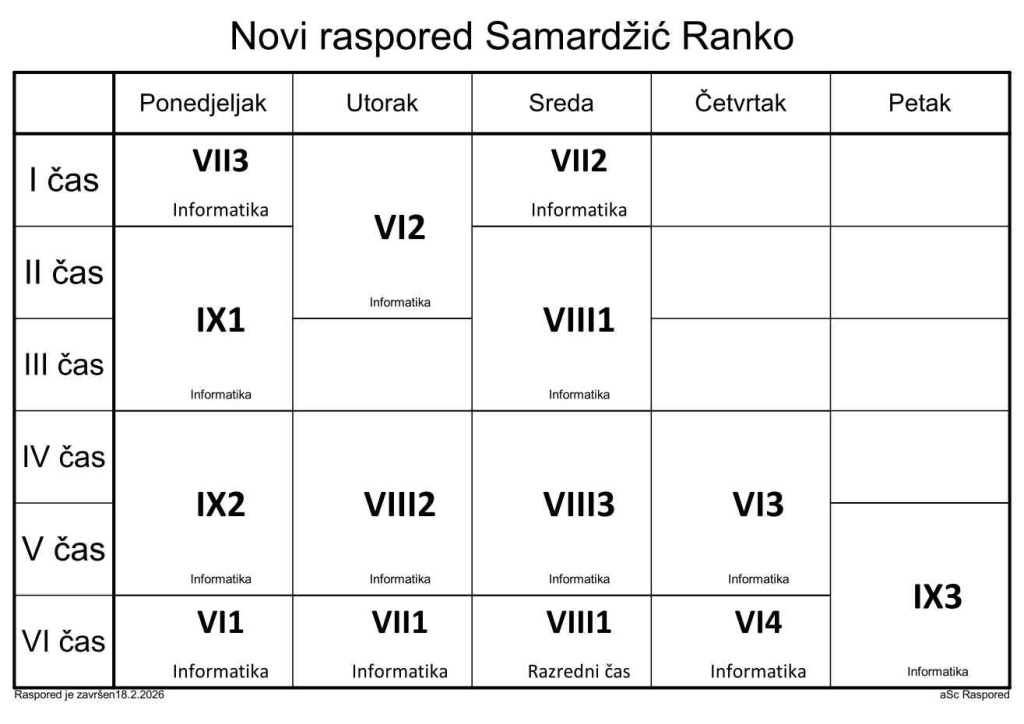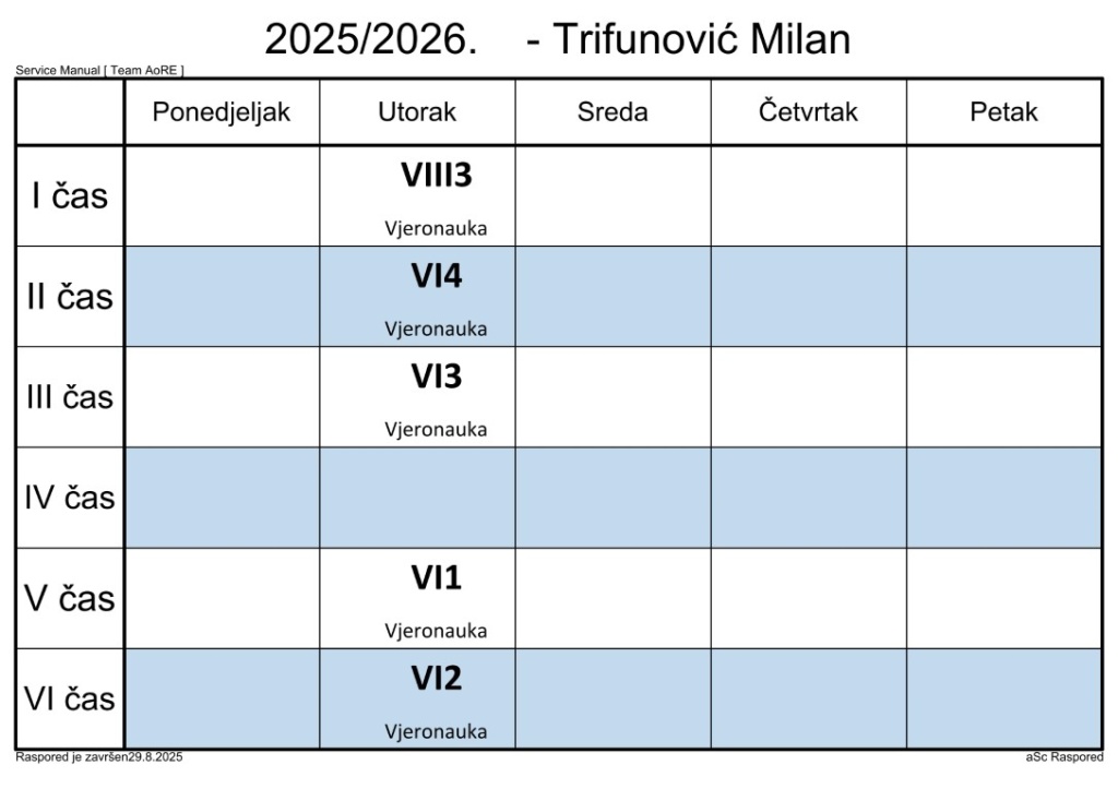 Распоред часова за наставнике у школској 2025/2026. години