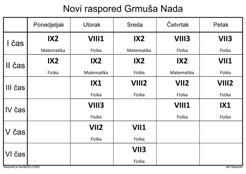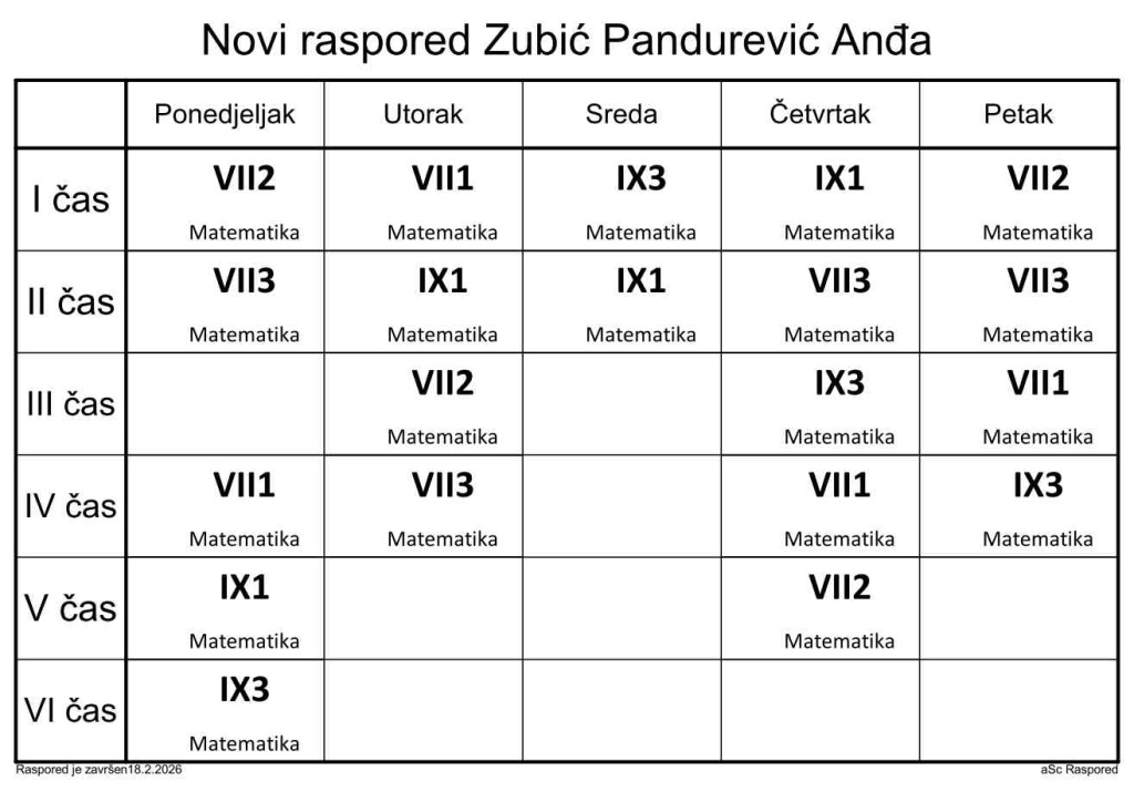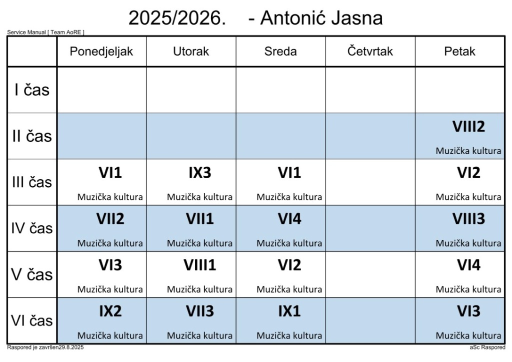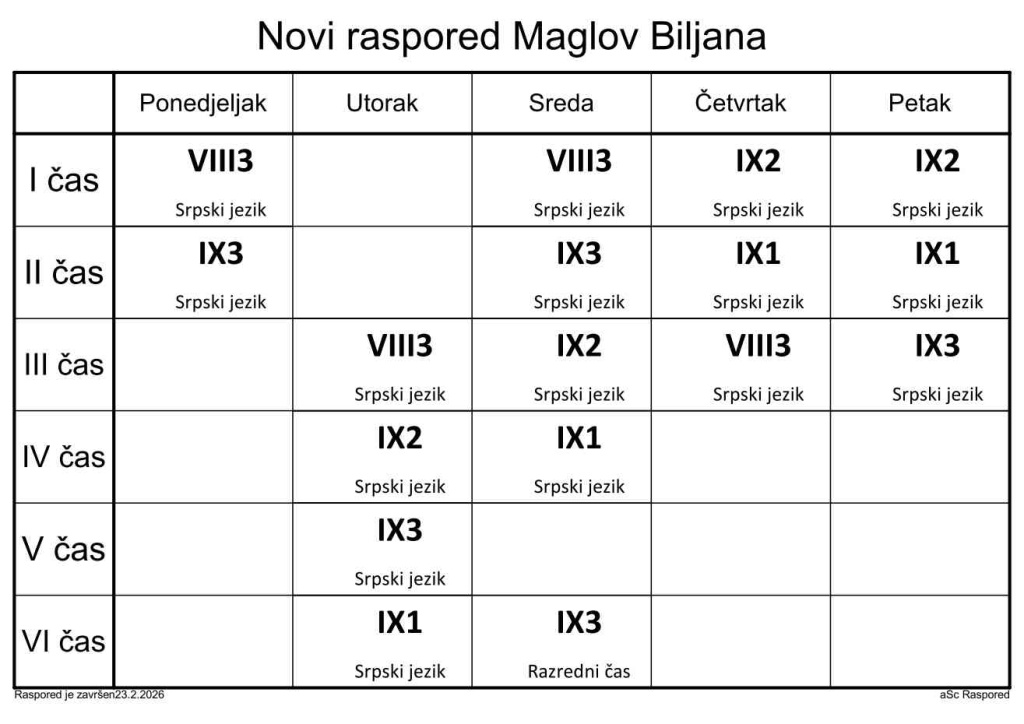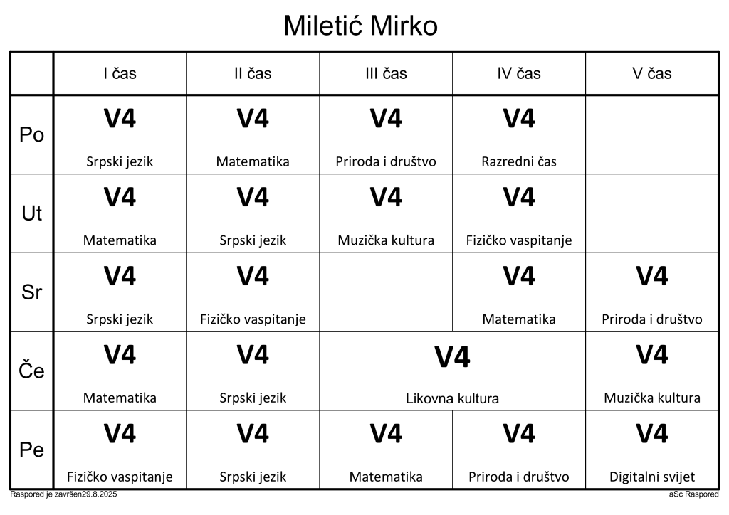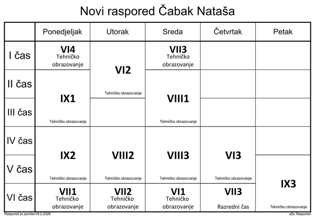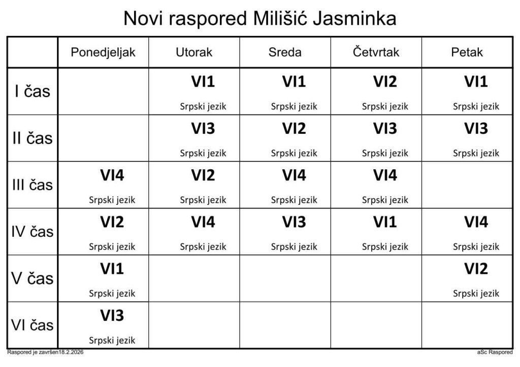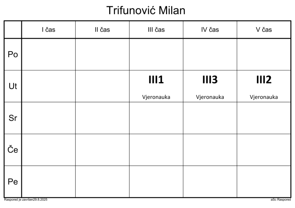 Распоред часова за наставнике у школској 2025/2026. години