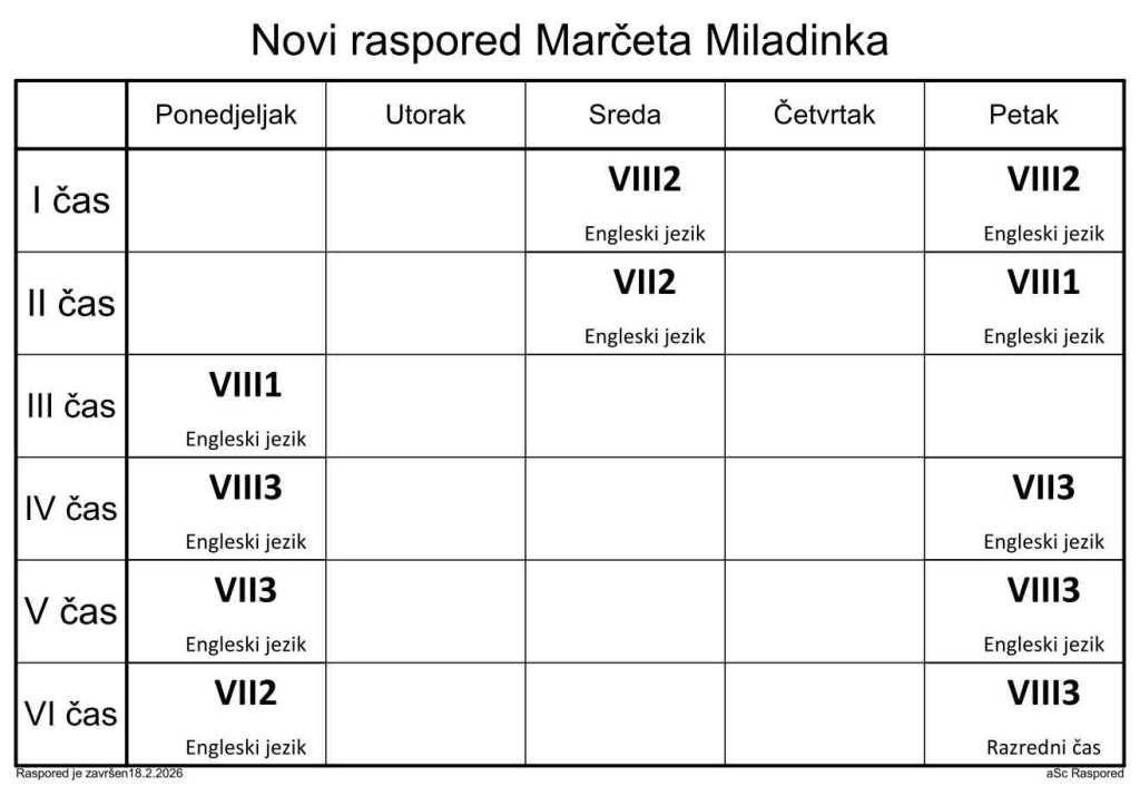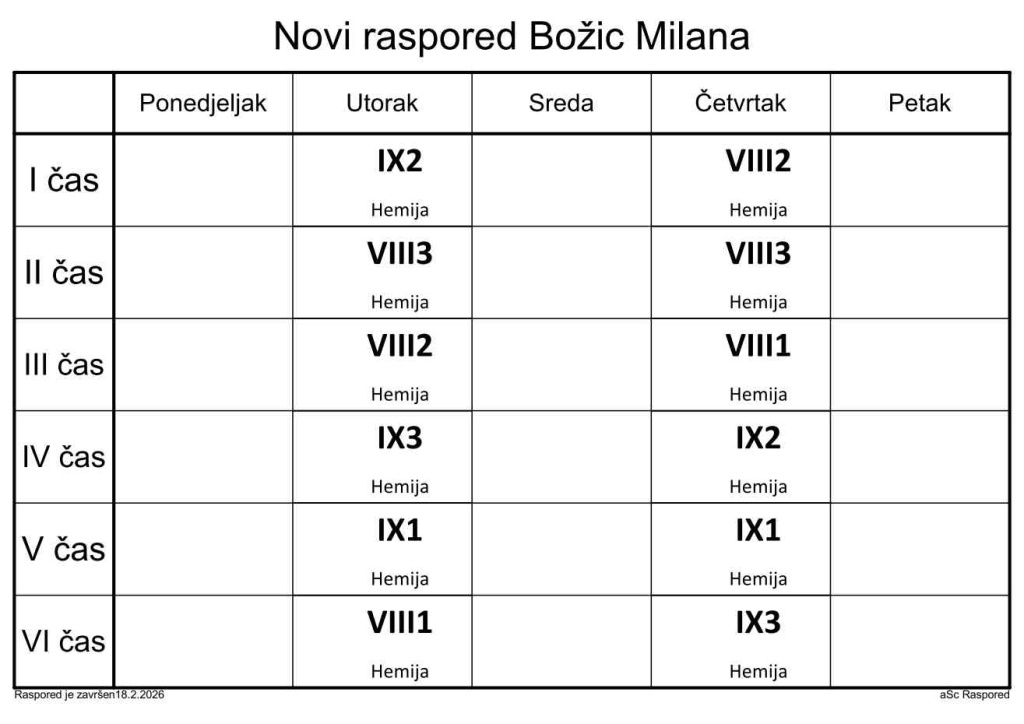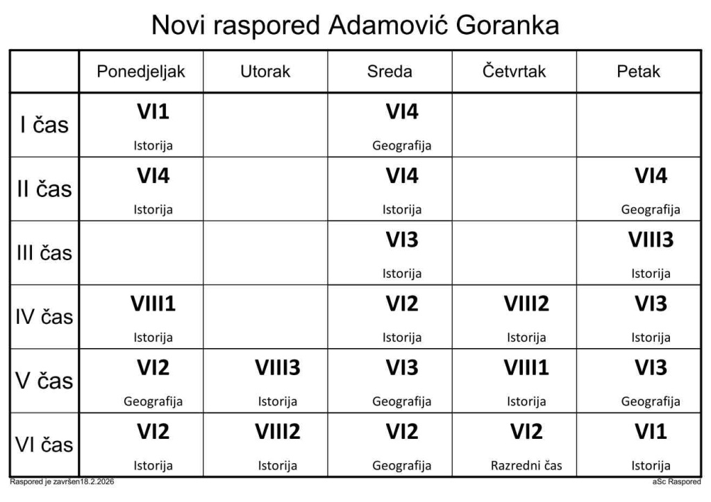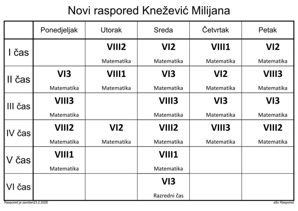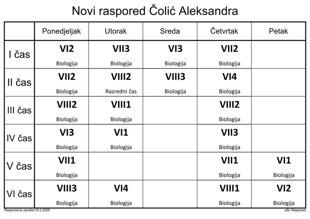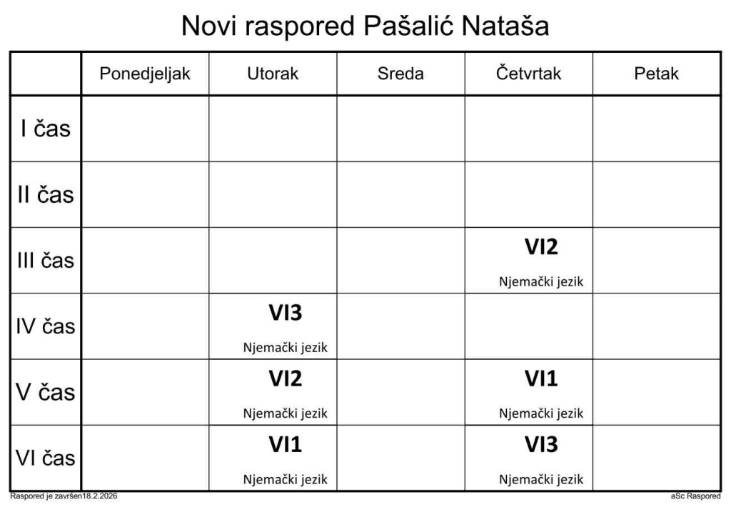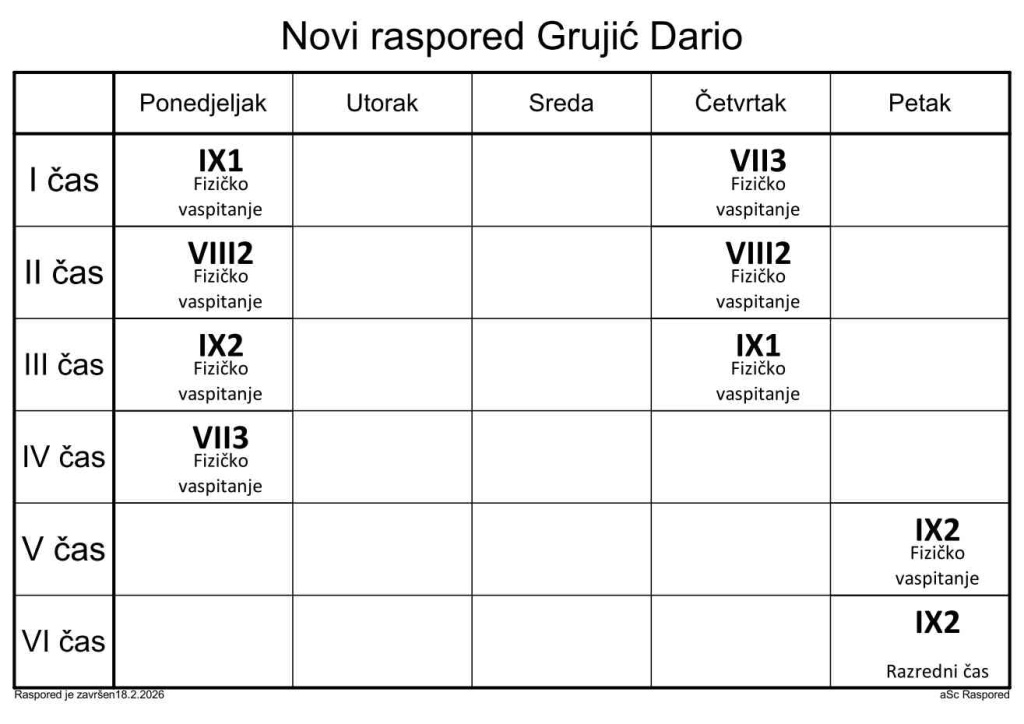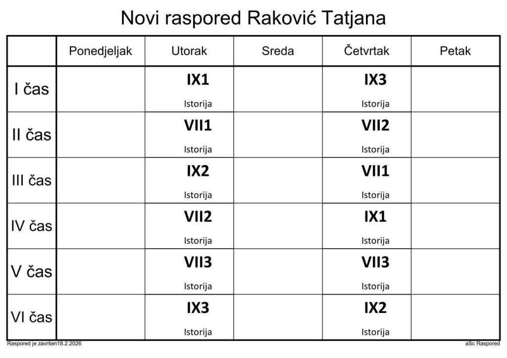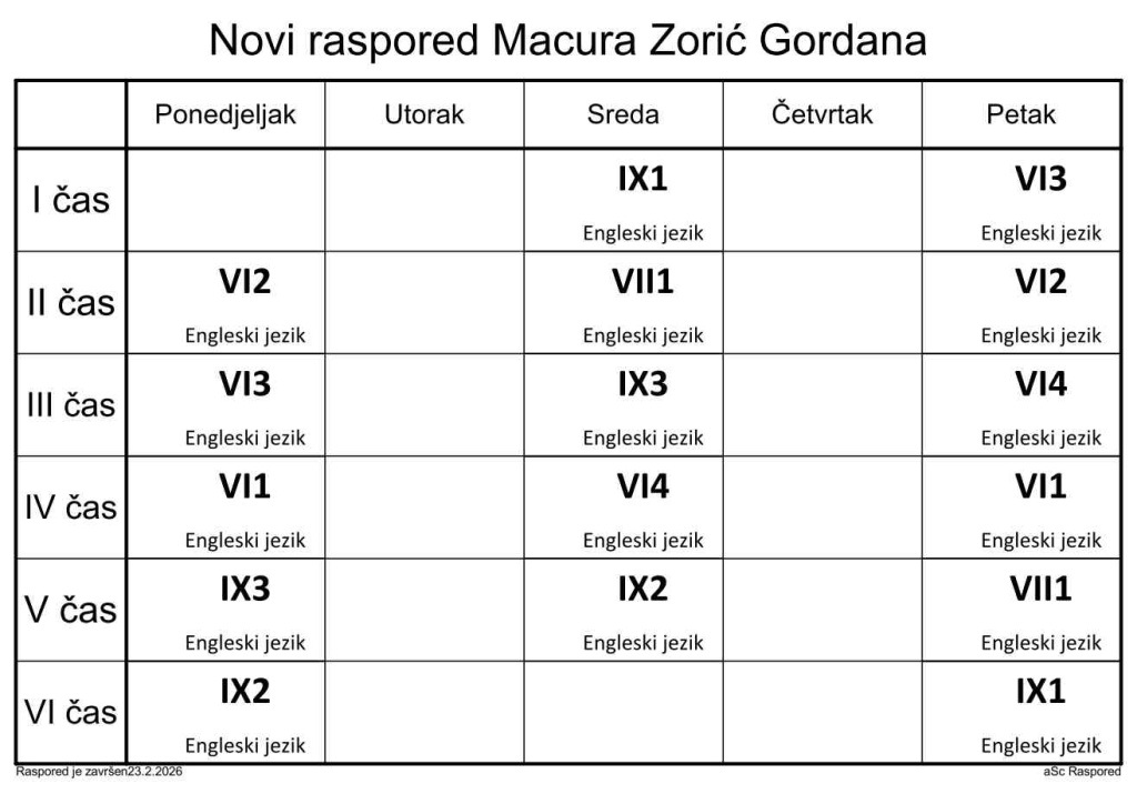 Распоред часова за наставнике у школској 2025/2026. години